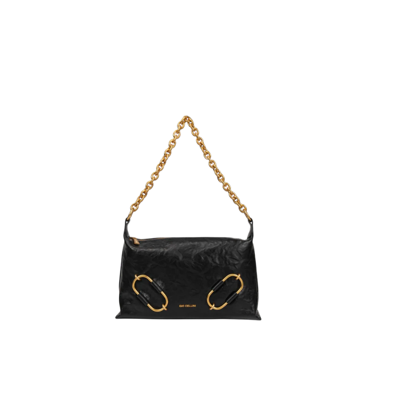 MODELLO Borsa in ecopelle effetto vintage con logo frontale lettering, manico singolo in catena removibile, tracolla removibile e regolabile, anelli decorativi, dettagli gold