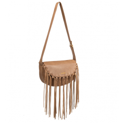 MODELLO Borsa a spalla in ecopelle effetto vintage con logo frontale embossed, patta con frange decorative, tracolla regolabile, dettagli gold