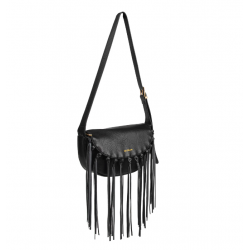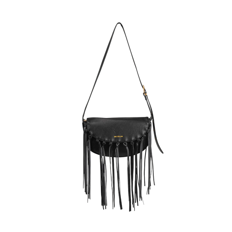MODELLO Borsa a spalla in ecopelle effetto vintage con logo frontale embossed, patta con frange decorative, tracolla regolabile, dettagli gold